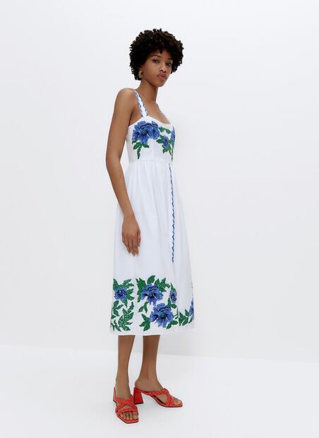 Es importante recordar que los vestidos midi son tan favorecedores para bajitas debido a que terminan antes de los talones, debajo de las rodillas. Ese breve espacio de piel entre la prenda y el zapato puede alargar la figura.