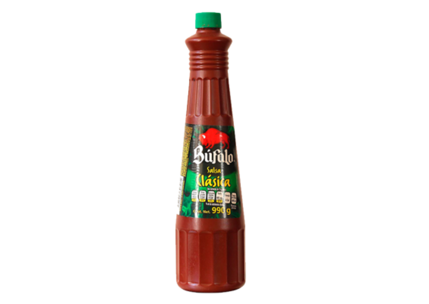 La salsa clásica búfalo tiene como ingredientes el agua, ácido acético, chile guajillo, sal yodada, azúcar, goma xantana, condimentos, benzoato de sodio como conservador, colorante artificial rojo allura AC y ajo deshidratado.