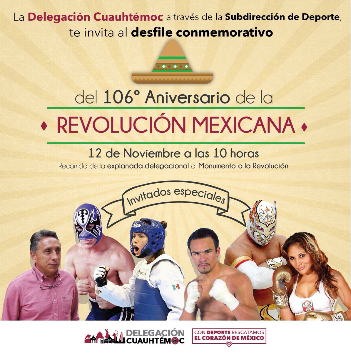 A sports parade is taking place in Mexico City to commemorate the 106th anniversary of the Mexican Revolution, where soccer players, swimmers, wrestlers and martial arts practitioners, among others, march from Jesus García avenue in Buenavista to the Revolution’s Monument.