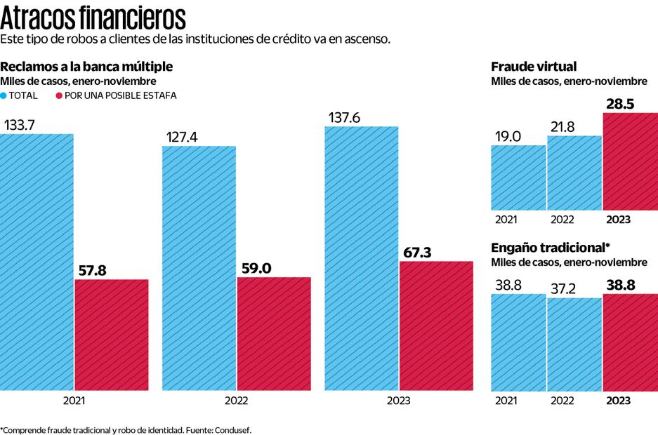 Los datos más recientes de la Condusef muestran que de enero a noviembre de 2023, de 137 mil 551 reclamaciones contra bancos, 42% fueron atribuidas a un posible fraude virtual contra sus usuarios.