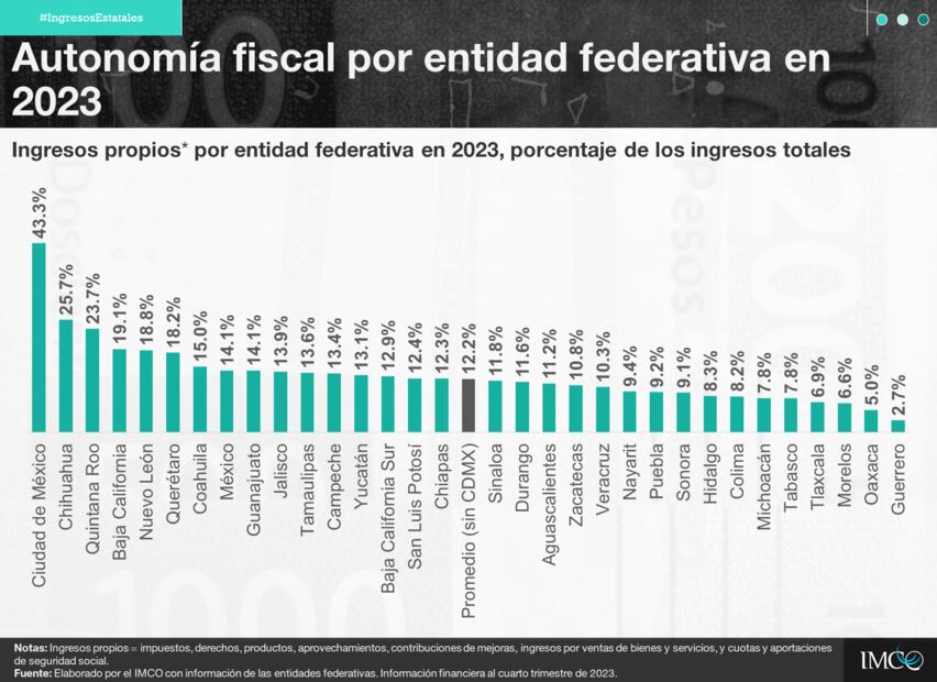 El Instituto Mexicano para la Competitividad (IMCO) a través del Informe Estatal de Ejercicio del Gasto (IEEG) 2024, dio a conocer que la autonomía fiscal de los 32 gobiernos es limitada y se ha mantenido sin cambios del 2015 al 2023, pasando apenas del 15.4% al 15.5%.