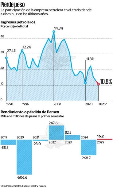 Así, de los ingresos totales reportados por el gobierno federal durante el primer semestre de 2025, apenas 10.8% se generaron por la actividad petrolera.