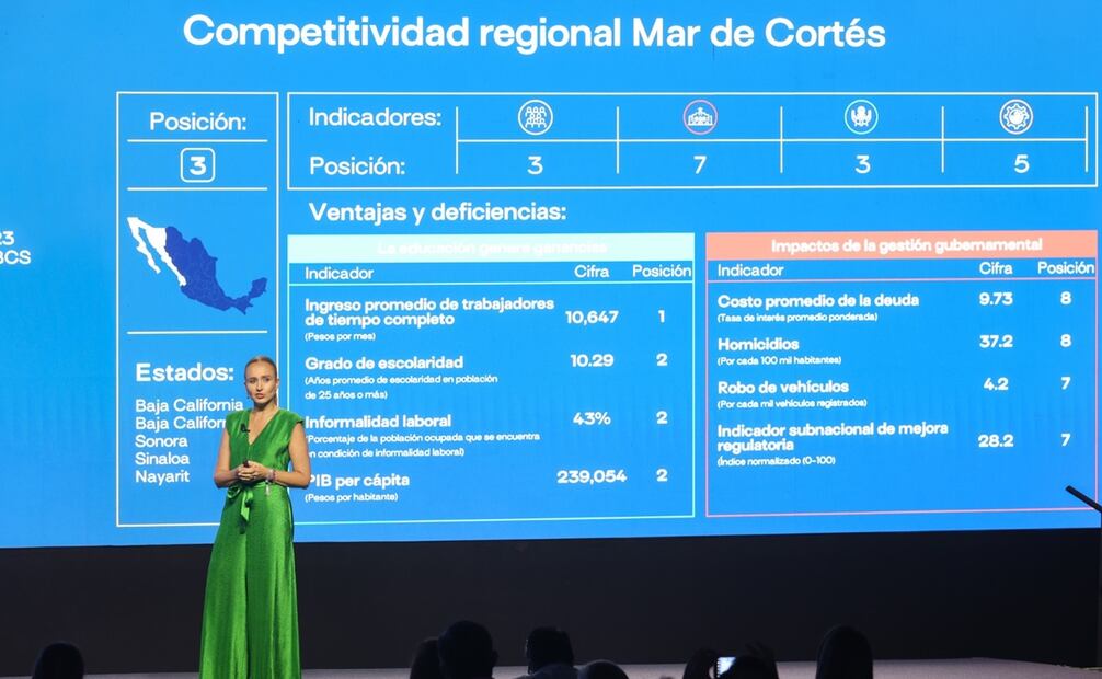 La directora del IMCO recordó que la región del Mar de Cortés presenta indicadores elevados en inseguridad, con números altos en homicidios y robo de autos, además de retos en desarrollo de infraestructura.