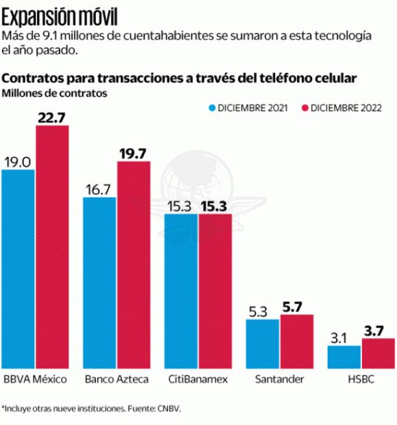 En un año, más de 9.1 millones de mexicanos contrataron servicios para realizar operaciones bancarias desde sus dispositivos móviles, con lo que al cierre de 2022 se alcanzó un total de 72 millones 617 mil clientes que utilizan aplicaciones bancarias en el país.