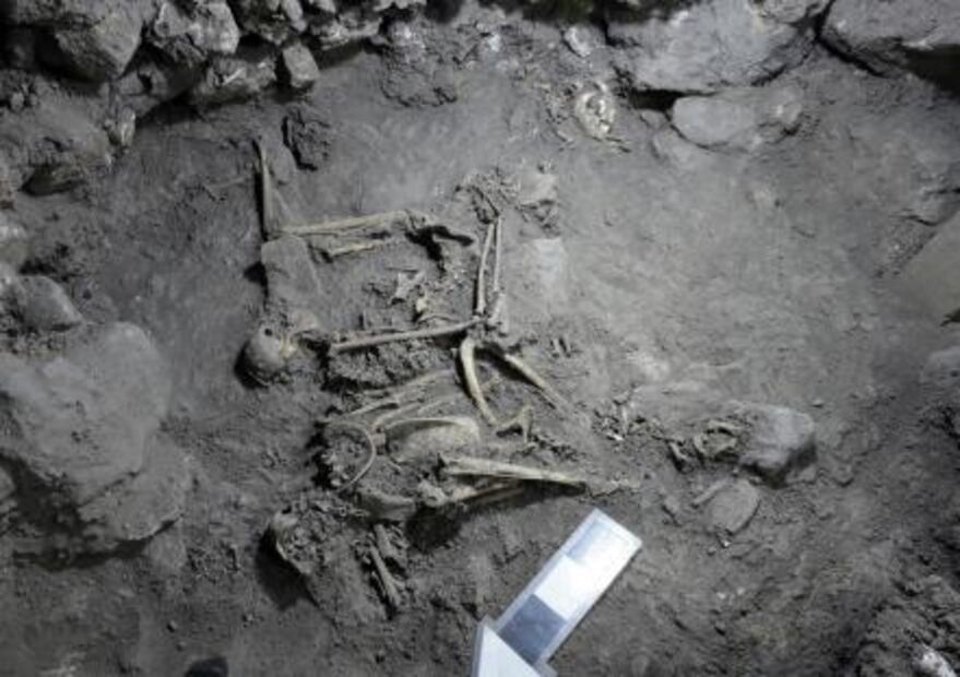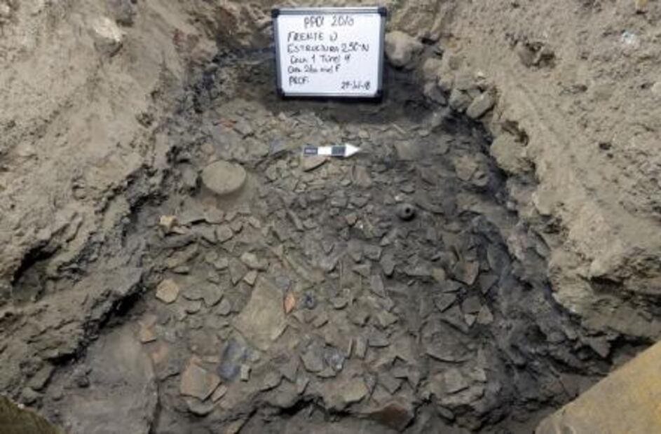 Los materiales, que incluían fragmentos de cerámica maya y una rica ofrenda de consagración y un depósito compuesto por miles de restos óseos humanos de individuos sacrificados , fueron hallados en esa zona, ubicada entre las pirámides del Sol y la Luna , al oeste de la Calzada de los Muertos .