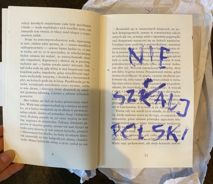 En un comunicado difundido en las redes sociales de la Fundación Olga Tokarczuk , se muestran fotografías de los volúmenes con las hojas recortadas, dibujos obscenos y mensajes como "¡no difames a Polonia!" o "¡vete a Bielorrusia!".