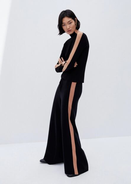 Si prefieres algo ajustado, pero que te permita tener facilidad de movimiento, este conjunto de jersey y pantalón con cintura elástica ajustable en tejido de punto, es perfecto para tus necesidades mientras estás en casa (pero, más adelante, si lo combinas con un trench o abrigo largo y unos botines de piel planos, tendrás el look perfecto para una salida de fin de semana al cine). Es bastante amplio en las piernas, desde los muslos hacia abajo. Las líneas laterales en contraste le dan un toque sport y diferente. También está disponible en la misma combinación, pero a la inversa. Este modelo es de MANGO.