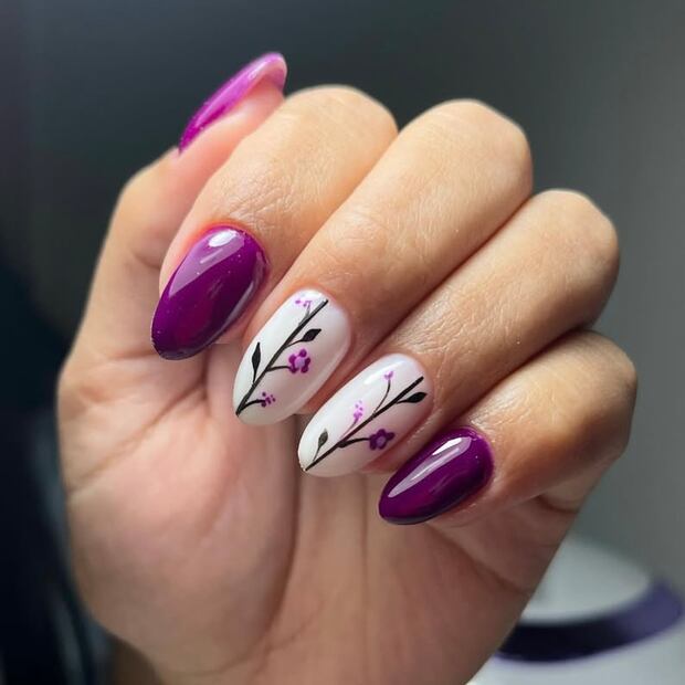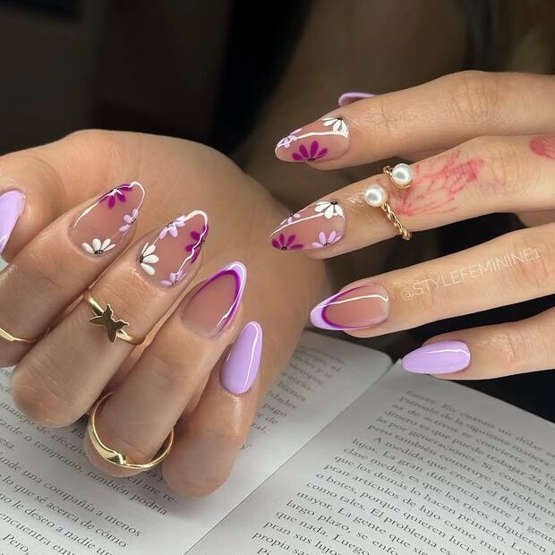 Para quienes prefieren tonos más profundos, esta tendencia apuesta por un morado más fuerte en la mayoría de las uñas, mientras que las demás presentan un diseño de flores sobre una base blanca, creando un contraste elegante.