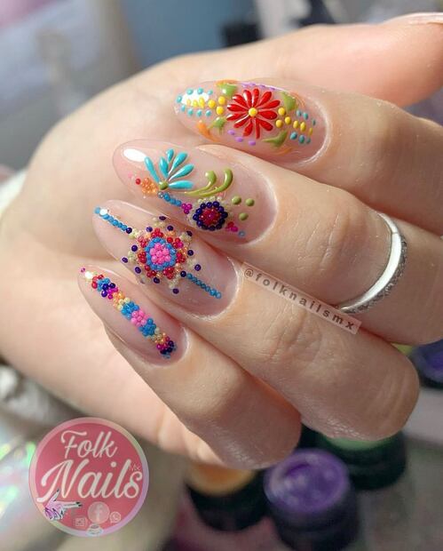 El estudio Folk Nails (IG: @folknailsmx) tiene mucha inspiración para el mes patrio. El colorido de estas florecitas nos pareció irresistible, es una gran opción para alternar durante el mes con los diseños con verde y rojo.