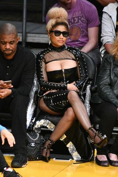 Un traje de látex, simulando a los famosos trajes sadomasoquistas de los ochenta, fue el look que la rapera eligió para ir al juego en Los Ángeles. Por si fuera poco, la rapera publicó varias fotografías en Instagram donde se logra ver que las prendas en látez y las medias de red serán el “nuevo negro” en la moda.