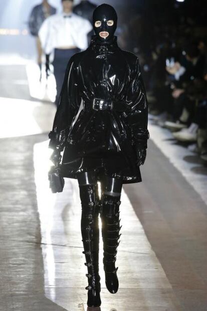 Este atuendo nos recordó a la pasarela de Otoño de Moschino liderada por Jeremy Scott presentada en Nueva York hace unos meses. La estética gótica e hipersexualizada provocaron un sin número de comentarios. Cabe destacar que esta colección también posee prendas en látex y con una inspiración sado.