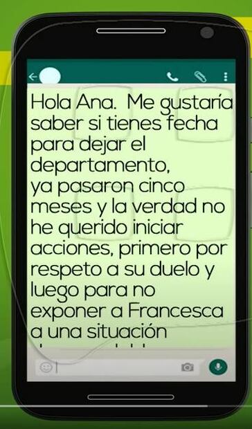 “Hola Ana. Me gustaría saber si tienes fecha para dejar el departamento, ya pasaron cinco meses y la verdad no he querido iniciar acciones, primero por respeto a su duelo y luego para no exponer a Francesca a una situación desagradable, pero comprenderás que tengo muchas responsabilidades y no puedo permitir que su estancia sea permanente, espero podamos terminar con esta situación de forma pacífica por el bien de todos, gracias”, se lee.