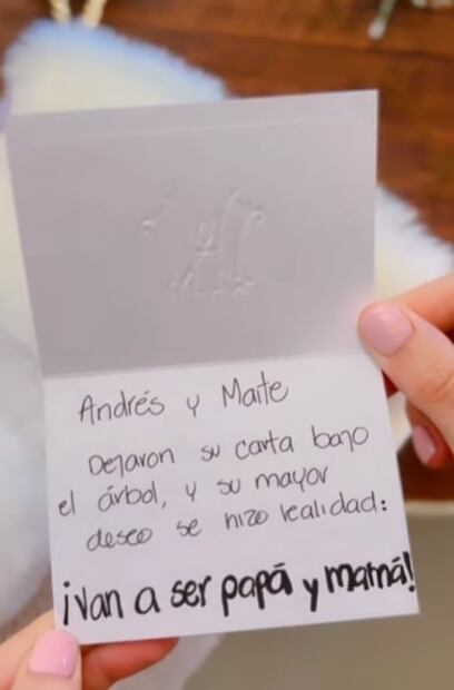 Pero el anuncio no acabó ahí, ya que posteriomente se alcanzan a percibir unas botas navideñas en las que venía un sobre con el mayor deseo de la enamorada pareja: “Andrés y Maite. Dejaron su carta bajo el árbol y su mayor deseo se hizo realidad: "¡Van a ser papá y mamá!".