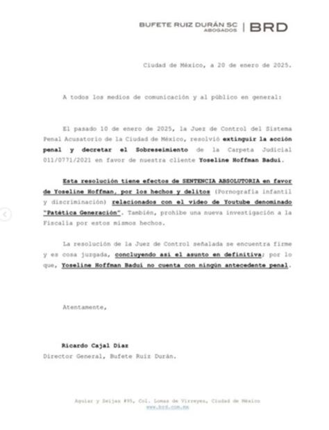 "La jueza de Control del Sistema Penal Acusatorio de la Ciudad de México, resolvió extinguir la acción penal y decretar el sobreseimiento a favor de nuestra cliente Yoseline Hoffman Badui", se lee en el documento.