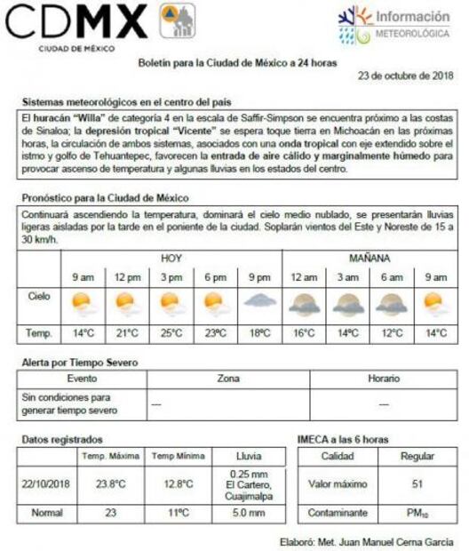 En la Ciudad de México se estima una temperatura máxima de 23 a 25 grados centígrados y mínima de 11 a 13 grados. En tanto que el Estado de México se espera temperatura máxima de 22 a 24 grados centígrados y mínima de 9 a 11 grados.