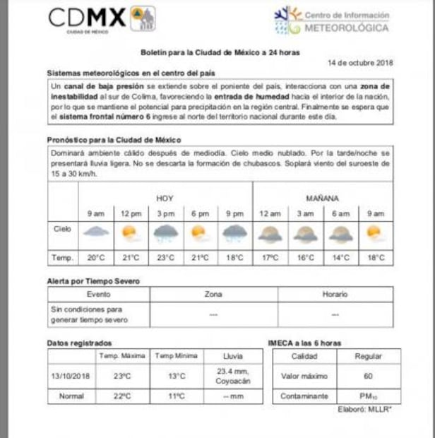 reportó que este domingo se prevé cielo medio nublado en la mañana y nublado por la tarde con potencial de lluvias e intervalos de chubascos en áreas de la Ciudad de México y en el Estado de México, con posible actividad eléctrica.