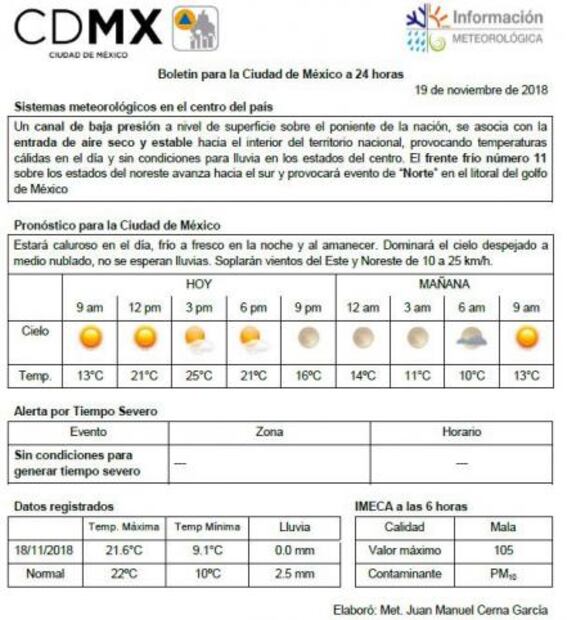 Este lunes se prevé cielo despejado la mayor parte del día y sin lluvia en la Ciudad de México y el Estado de México , informó el Servicio Meteorológico Nacional (SMN).