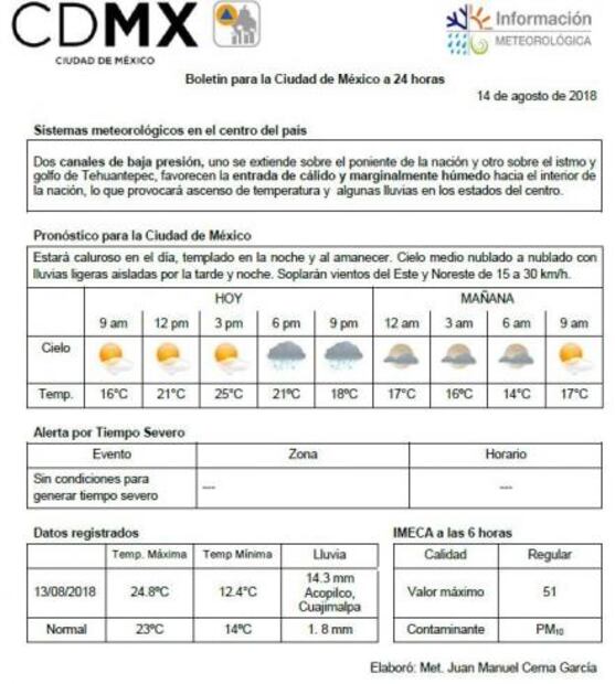En la Ciudad de México se prevé una temperatura máxima de 23 a 25 grados centígrados y mínima de 12 a 14 grados.
