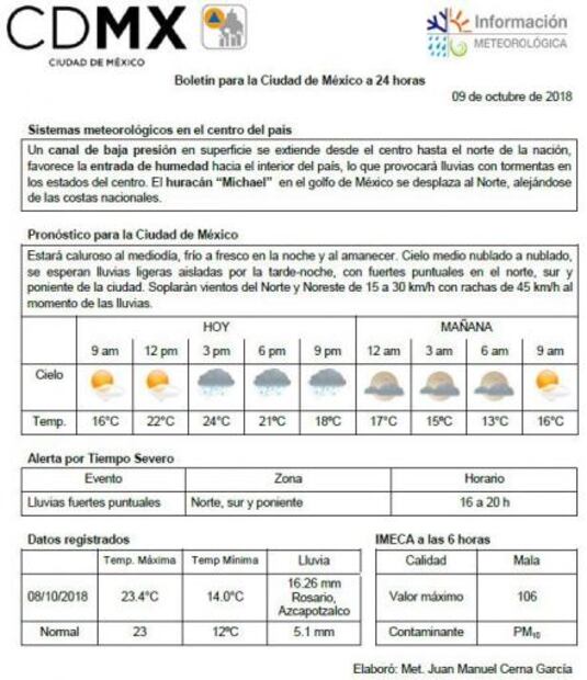 En el reporte del organismo dependiente de la Comisión Nacional del Agua (Conagua), también pronosticó que en el municipio de Texcoco y en el Aeropuerto Internacional Benito Juárez de la Ciudad de México, prevalecerá potencial de lluvias con intervalos de chubascos en la tarde y noche.