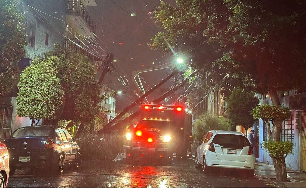 La lluvia en la Ciudad de México provocó que un árbol de más de 10 metros cayera sobre dos postes de luz, dejando a vecinos de la calle Playa Lorena, colonia San Andrés Tetepilco, sin luz y con daños en sus viviendas.