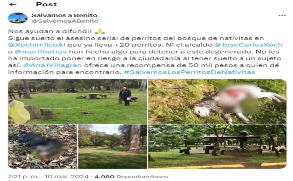 En la publicación se hace mención que el presunto asesino serial lleva más de 20 animales lastimados, todos encontrados en la alcaldía Xochimilco, además de que las autoridades correspondientes no han hecho nada por encontrarlo.