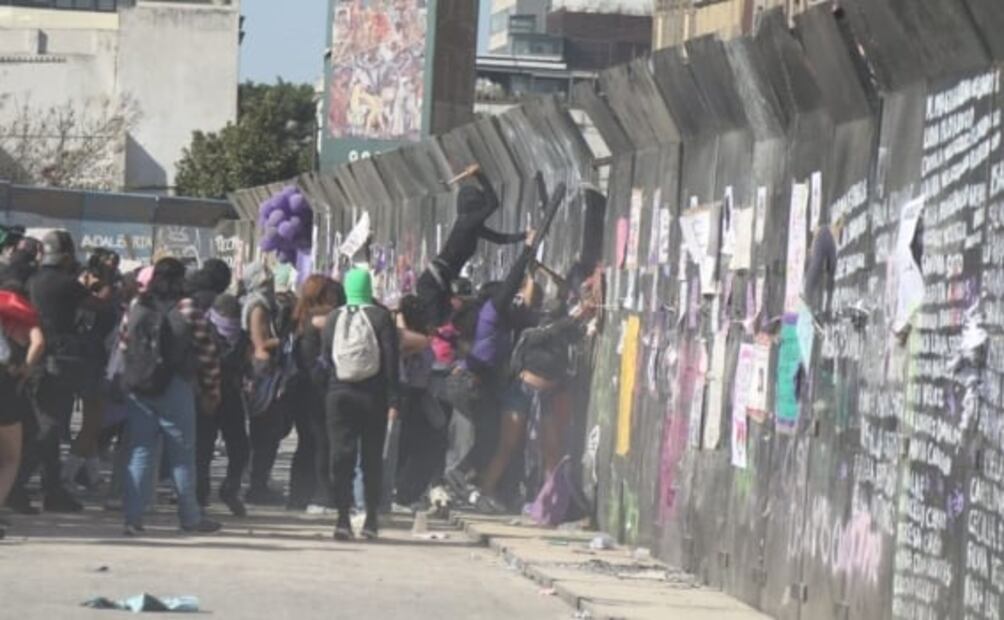 Una de las feministas que logró doblar la estructura, intentó pasar la valla pero fue rociada con gas. Miguel uno de los integrantes de la Brigada Marabunta asegura que dicho gas puede causar fuertes daños a la salud.