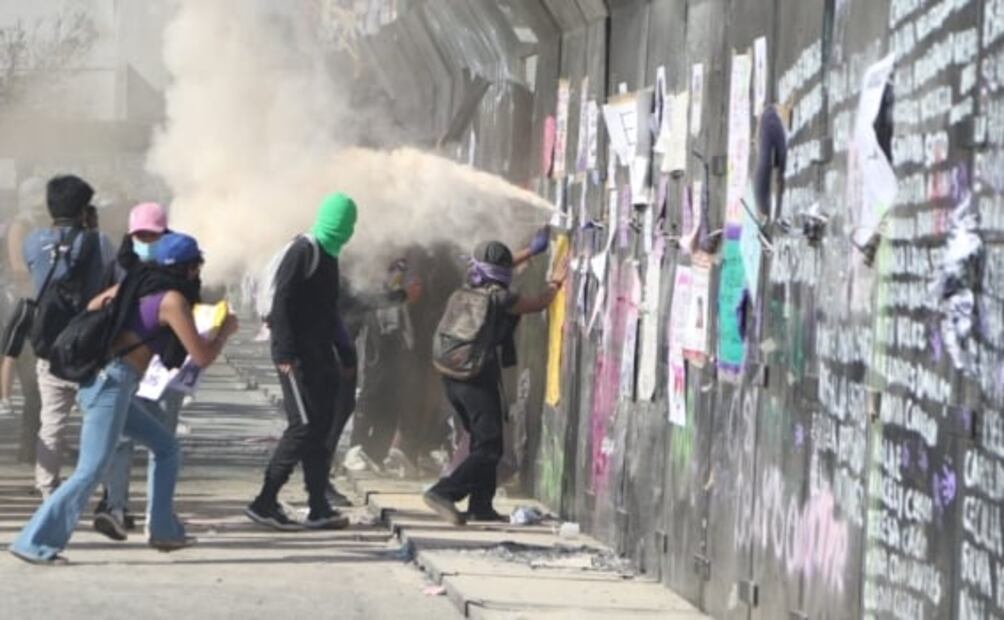, colectivos feministas fueron rociados con gas para tratar de dispersarlas después de que las manifestantes lograron doblar una de las vallas que protegen el Palacio Nacional.
