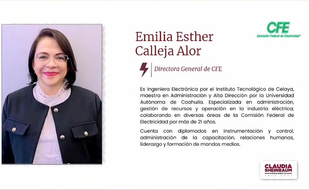 Claudia Sheinbaum, virtual presidenta electa, presentó este lunes 12 de agosto a Emilia Esther Calleja Alor como próxima directora de la Comisión Federal de Electricidad (CFE), quien se sumará a su gabinete presidencial para el periodo 2024-2030.