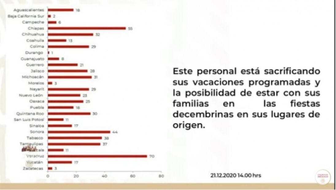 Agregó que en el llamado se plantea apoyar con traslados, boletos de avión, alojamiento, alimentación, lavandería, transporte a unidades, además de otros incentivos institucionales como la Comisión Covid, para quienes ya tenían sus vacaciones programadas, o la Guardia Covid.