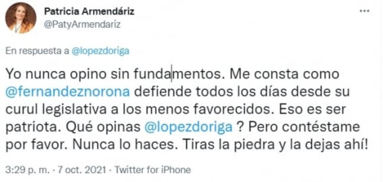 “Me consta como Fernández Noroña defiende todos los días desde su curul legislativa a los menos favorecidos. Eso es ser patriota”, expresó Armendariz.