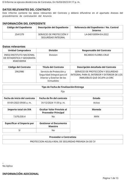 El Instituto Nacional de Estadística y Geografía (Inegi) contrató a Protección Águila Real de Seguridad Privada S.A. de C.V. por un monto de 8 millones 897 mil 235 pesos con IVA incluido, como lo estipula el contrato Servicio de protección y seguridad integral para el interior y exterior de los inmuebles, con código 2962986 para el periodo comprendido entre el 1 de enero de 2023 y el 31 de diciembre de 2024.