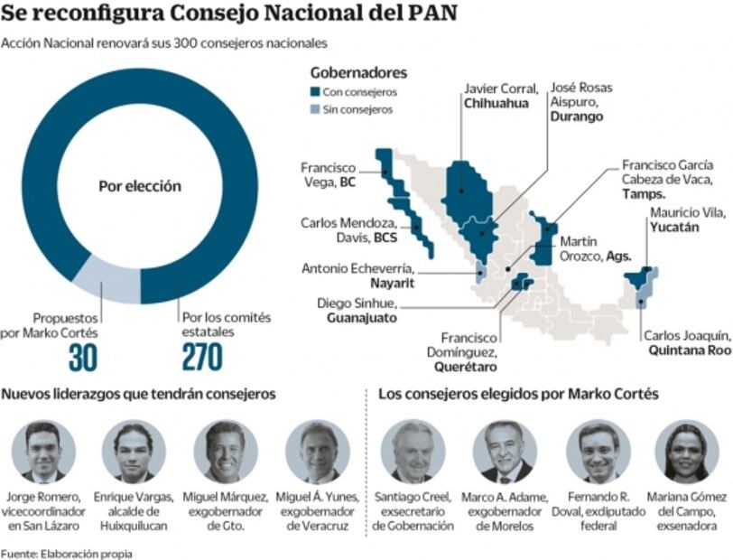 Los grupos que antes representaban el calderonismo y el morenovallismo en el Consejo Nacional, ahora son ocupados por las élites de los gobernadores y de los liderazgos estatales, como Jorge Romero en la Ciudad de México, el alcalde de Huixquilucan, Estado de México, Enrique Vargas, o el de los exgobernadores como Miguel Márquez (Guanajuato) y Miguel Ángel Yunes (Veracruz).