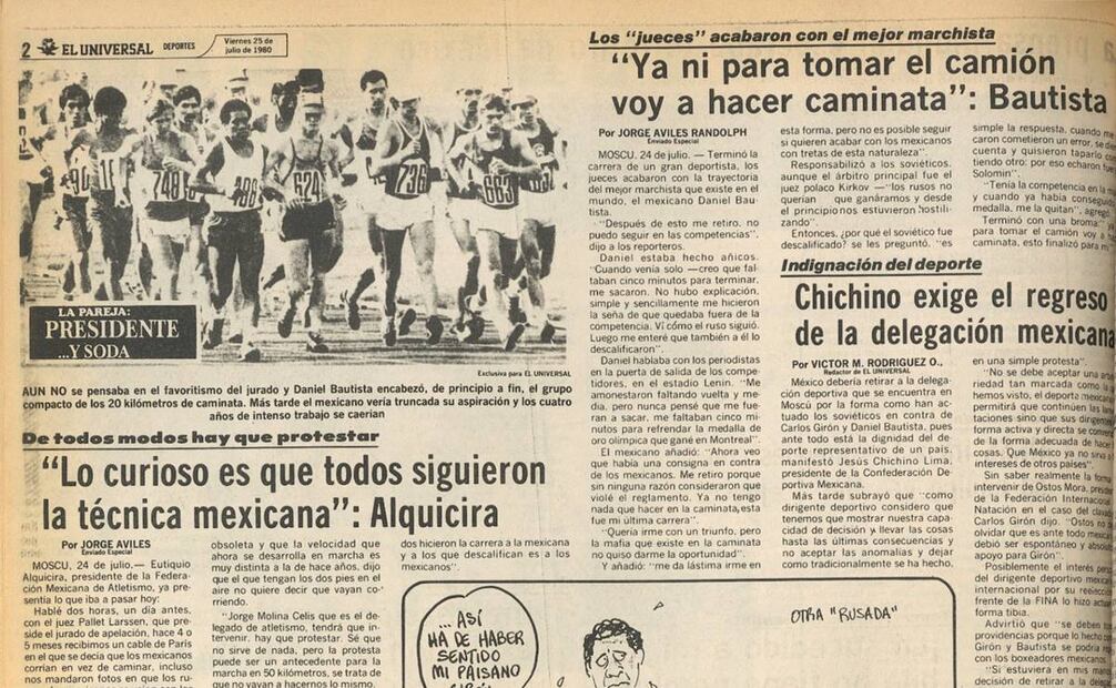 Según se leía, “en el momento en que se encaminaba por la recta hacia la entrada principal del Estadio Lenin de Moscú, en primer lugar y con el ruso Solomin siguiéndolo a 40 metros de distancia, Daniel Bautista, de México, fue descalificado en la prueba de 20 kilómetros de caminata”.