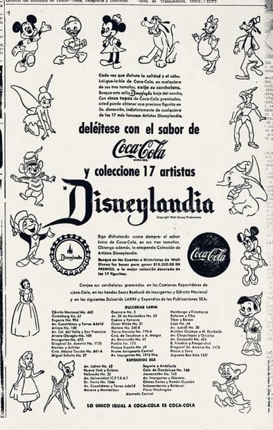 Cabe mencionar que una de las primeras campañas de este tipo se dio a conocer en las páginas de este diario, en noviembre de 1956, con una publicidad pagada de una famosa cadena de refrescos con la promoción de canjear las corcholatas marcadas con el sello de Disneylandia, por 17 personajes de Disney -de plástico monocromático- en los camiones repartidores de la bebida gaseosa.