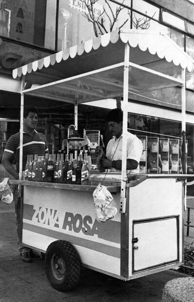 Imagen de los años 80 de la zona rosa, donde se observa a un vendedor de refrescos de botella de vidrio con sus tapas de corcholata. Archivo EL UNIVERSAL.