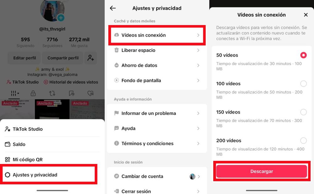 Los videos descargados serán diversos de acuerdo a tu algoritmo. Aunque debes saber que esto puede consumir parte de tu almacenamiento, por lo que te recomendamos tener la suficiente cantidad.