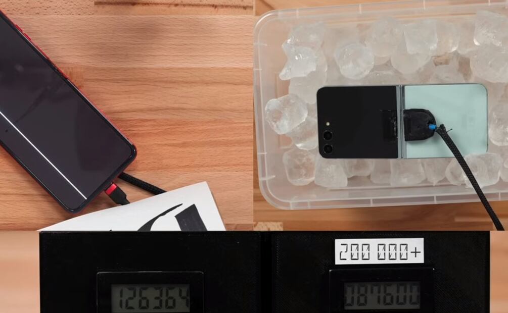 Por ello, decidieron ponerlo a prueba en otros contextos como hielo, arena e incluso a una mezcla de huevo con azúcar y agua, hasta después de 100 mil pliegues más el celular mostro una línea en la parte derecha de la pantalla, además que la bisagra ya no se mantenía derecha en posición horizontal.