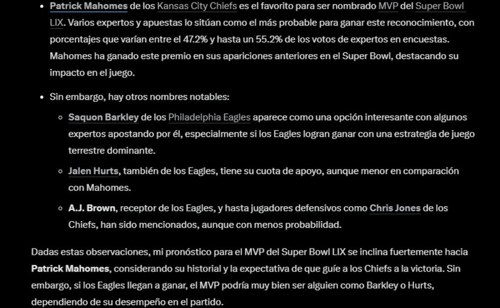 Por su parte, Grok echó mano de estadísticas y reportes de expertos para concluir que "mi pronóstico para el MVP del Super Bowl LIX se inclina fuertemente hacia Patrick Mahomes, considerando su historial y la expectativa de que guíe a los Chiefs a la victoria".