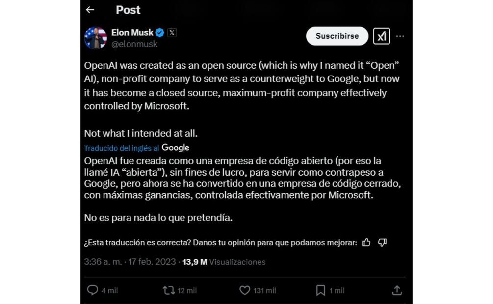 Esto al parecer no fue el agrado de Musk pues en respuesta lanzó una publicación en X, antes Twitter en donde señalaba que “OpenAI fue creada como una empresa de código abierto (por eso la llamé “Open AI”), sin fines de lucro, para servir como contrapeso a Google, pero ahora se ha convertido en una empresa de código cerrado y de máxima ganancia controlada efectivamente por Microsoft”.