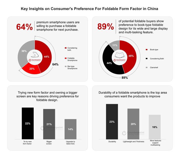 De acuerdo con la firma global de investigación, los usuarios se sienten atraídos por estos dispositivos por su diseño. Sin embargo, "este entusiasmo se ve atenuado por las preocupaciones sobre la durabilidad, prominencia del pliegue y el volumen del dispositivo cuando la pantalla está plegada", señaló Counterpoint.