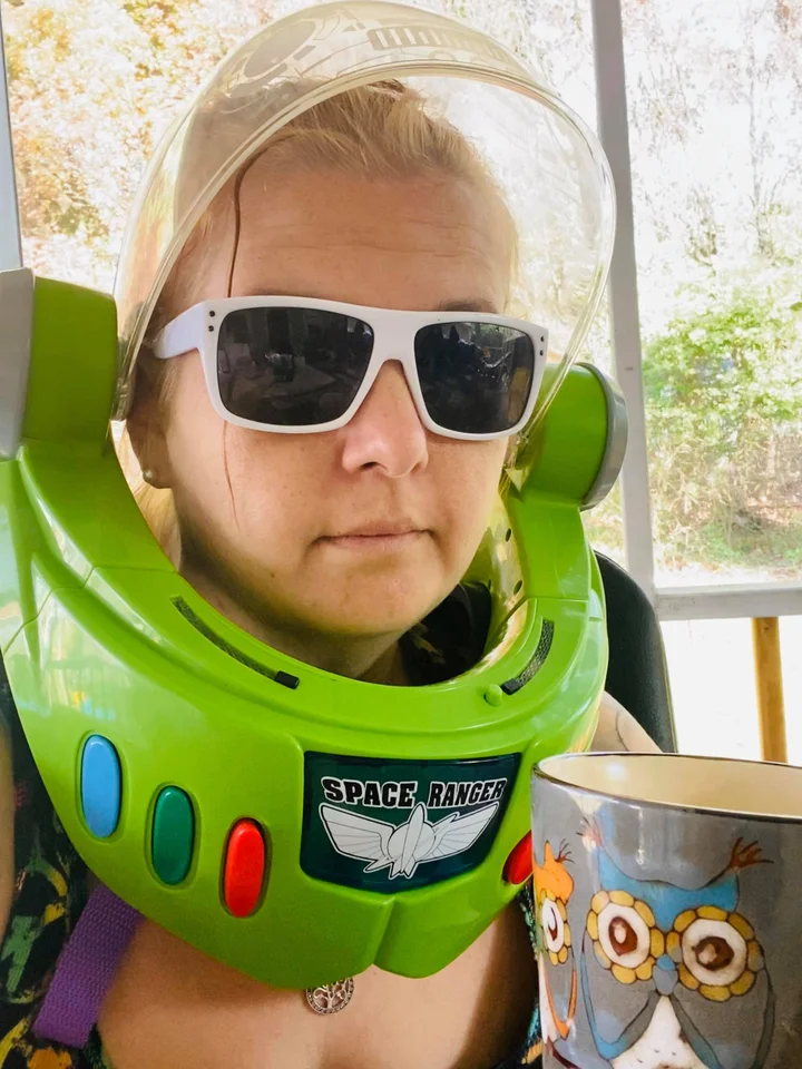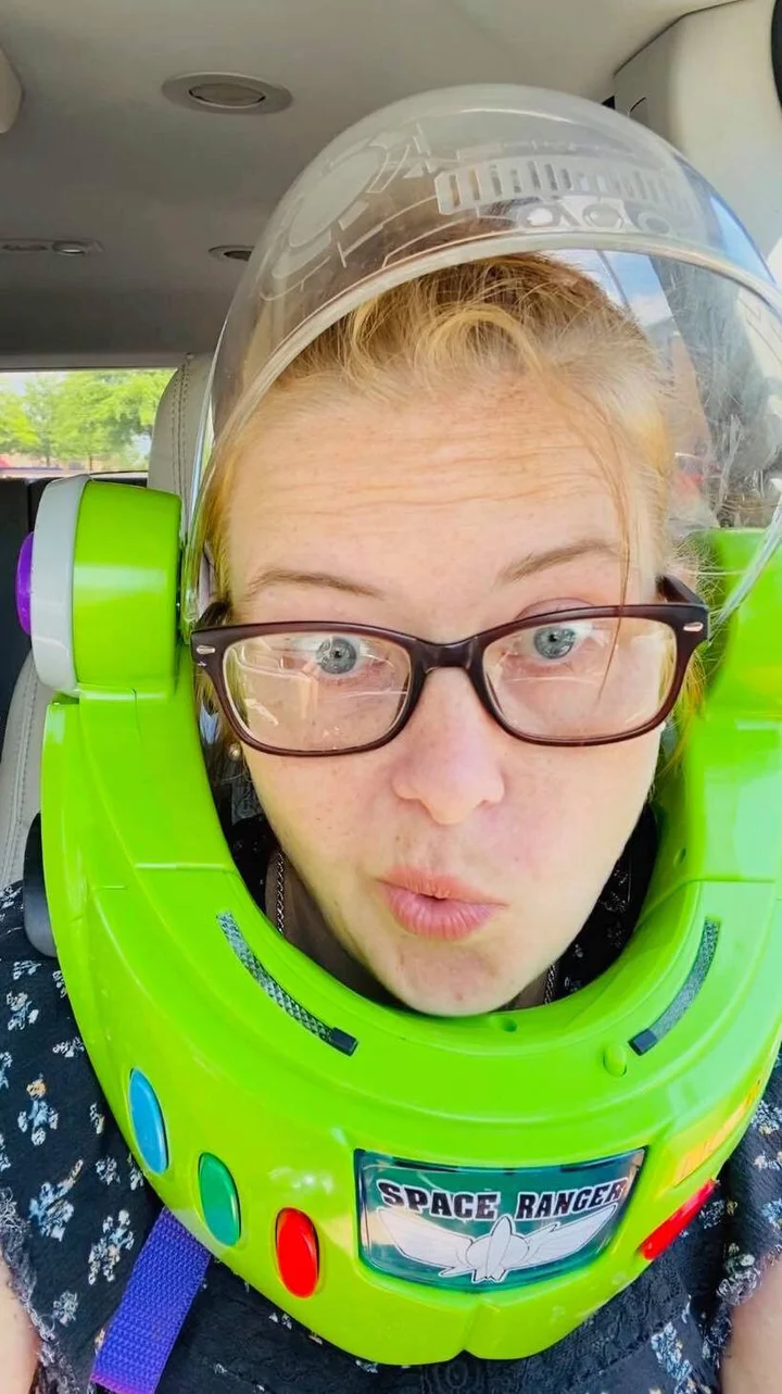 Una mujer en Estados Unidos se volvió viral en redes sociales , posterior a que asistiera a realizar sus compras a un centro comercial mientras usaba un casco del personaje Buzz Lightyear , de la película Toy Story .