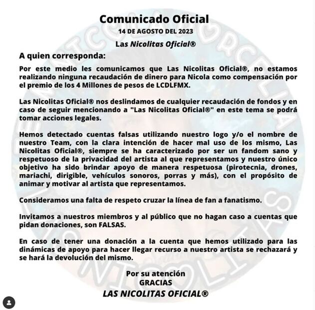 “Por este medio les comunicamos que L@s Nicolitas Oficial, no estamos realizando ninguna recaudación de dinero para Nicola como compensación por el premio de los 4 millones de pesos de LCDLFMX”, se lee en el texto.