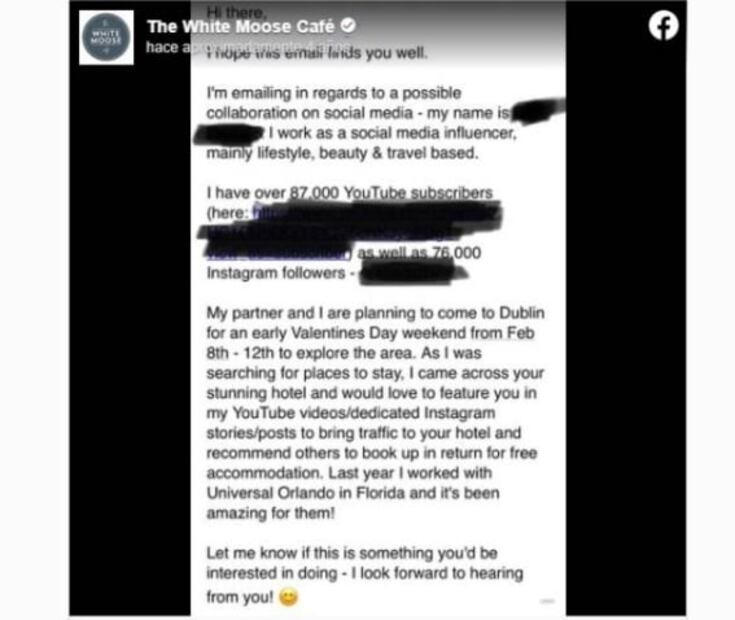 La youtuber británica Elle Darby, también fue evidenciada luego de que quiso quedarse en el hotel White Moose Café, pagándole al dueño con “exposición”. En un correo, la joven señaló que planeaba quedarse en dicho hotel el fin de semana de San Valentín, del 8 al 12 de febrero, y conocer la zona, a cambio de ello, les daría exposición en sus redes.