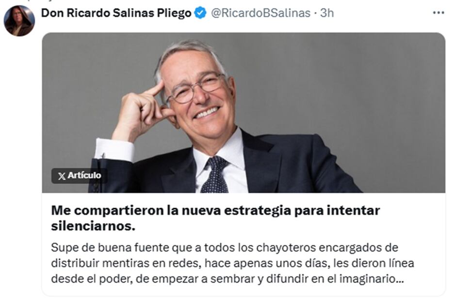 “Supe de buena fuente que a todos los chayoteros encargados de distribuir mentiras en redes, hace apenas unos días, les dieron línea desde el poder, de empezar a sembrar y difundir en el imaginario colectivo la idea de que al pueblo bueno NO le van a aplicar la #LeyCensura en las redes sociales, pero que hay que ‘devolverle la concesión de TV Azteca a los mexicanos’, porque nosotros somos ricos y malos".