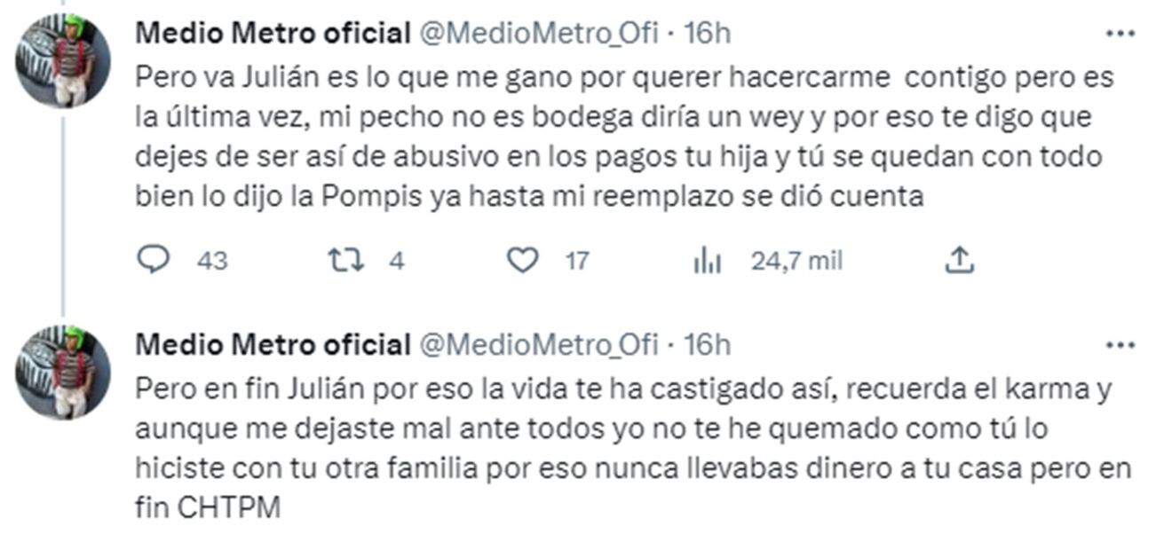 Finalmente, expresó: “Pero en fin Julián por eso la vida te ha castigado así, recuerda el karma y aunque me dejaste mal ante todos yo no te he quemado como tú lo hiciste con tu otra familia por eso nunca llevabas dinero a tu casa pero en fin CHTPM”.